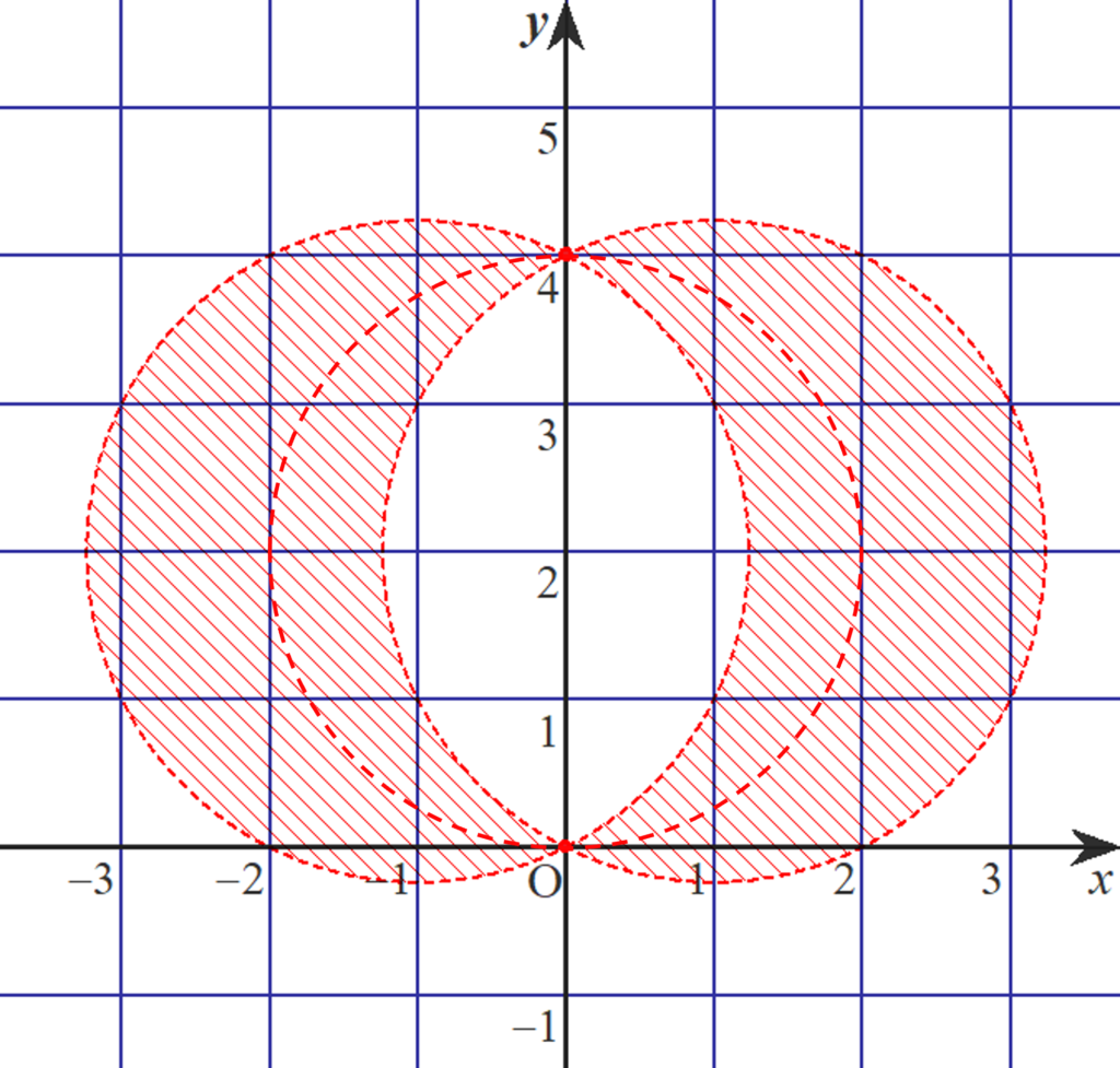以上より、円$C$の動く範囲は下図の斜線部(赤色部分)である。ただし、境界線および円 $x^2-y^{2}-4y=0$ 上の点は2点$(0, \,\pm 4)$を除いて含まない。