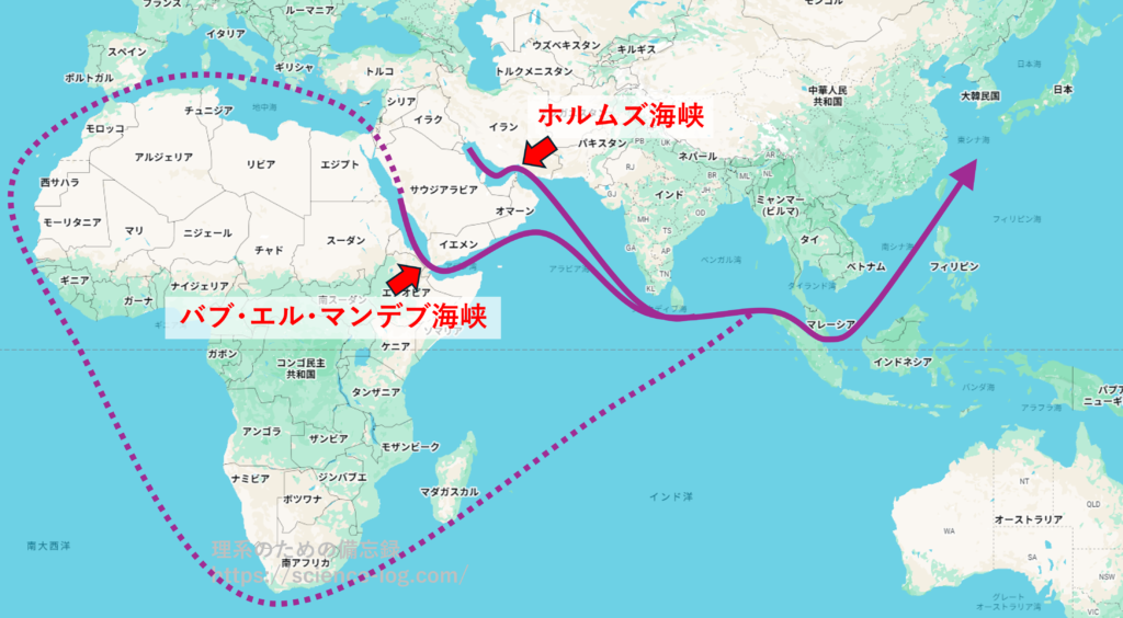 ただ、代替ルートが無いわけではない。実際、サウジアラビアの紅海に面したヤンブー港からパイプラインを通じて石油を積み込み、紅海とアデン湾を接続するバブ・エル・マンデブ海峡からインド洋に出るルートが存在する。しかしこの航路の場合、ホルムズ海峡を経由するルートに比べて4~5日程度余計に時間が掛かる。バブ・エル・マンデブ海峡やアデン湾では海賊や親イラン武装組織「フーシ派」による攻撃リスクがあるため、より安全に航行するためにはスエズ運河経由で喜望峰回りのルート(下図の破線)以外に選択肢が無く、この場合はホルムズ海峡経由の約2.5倍もの日数を要する。バブ・エル・マンデブ海峡もまたホルムズ海峡同様にチョークポイントであり、イランの息が掛かった交通の要衝である。中東地域の主要な石油生産拠点の地理関係についてはブルームバーグの記事が詳しい(参考資料2)。